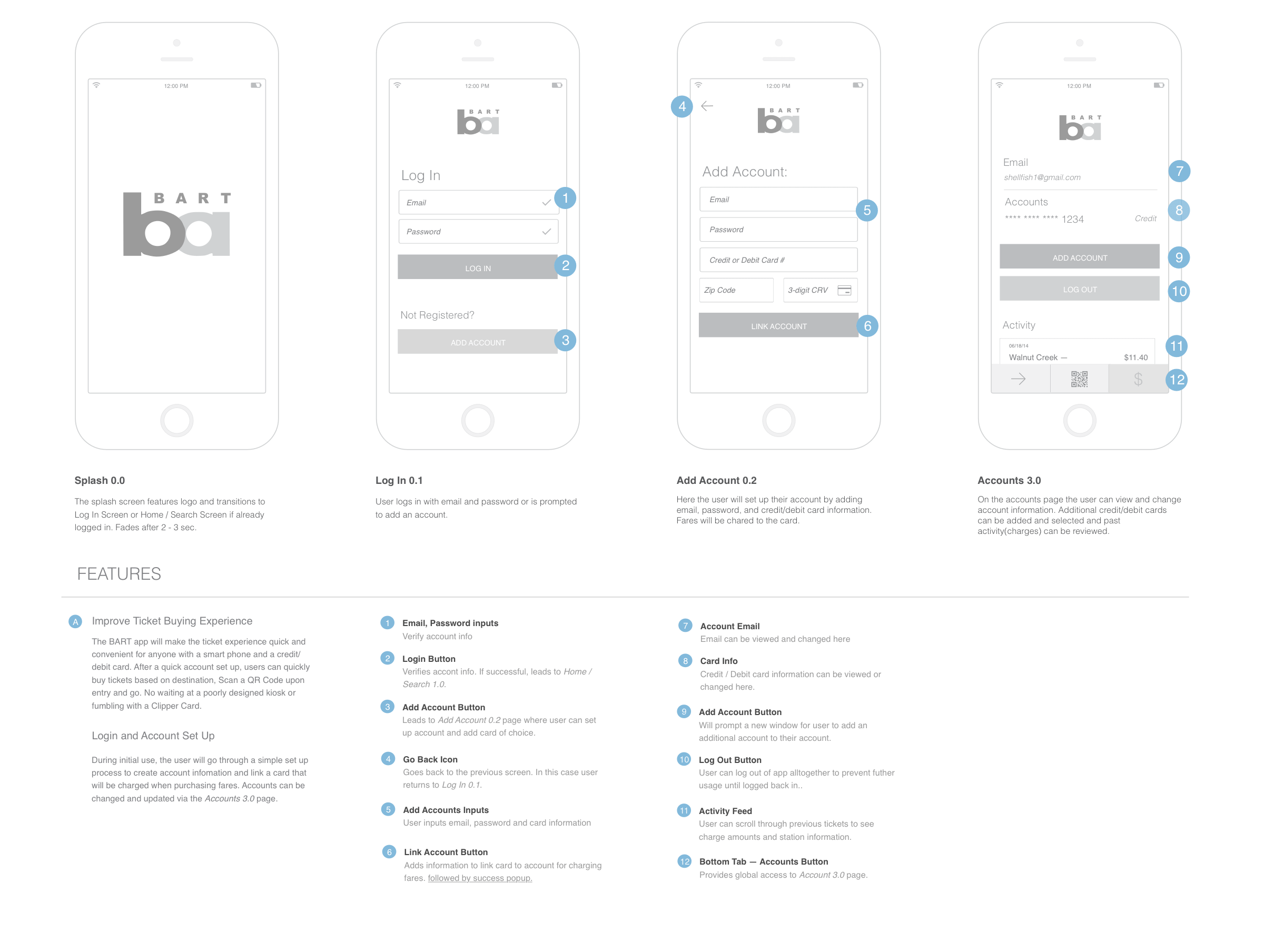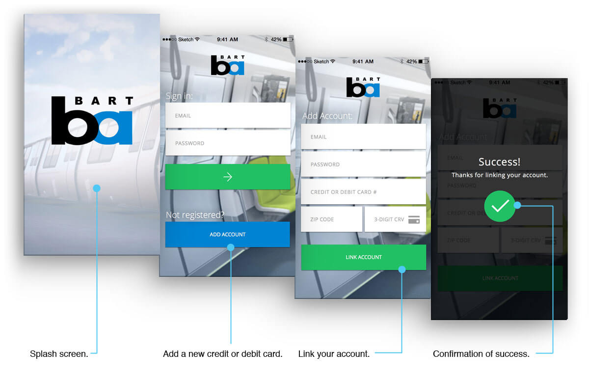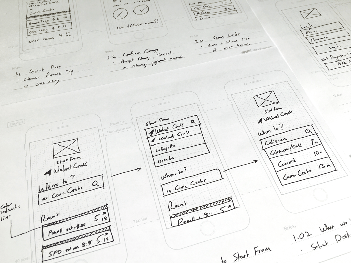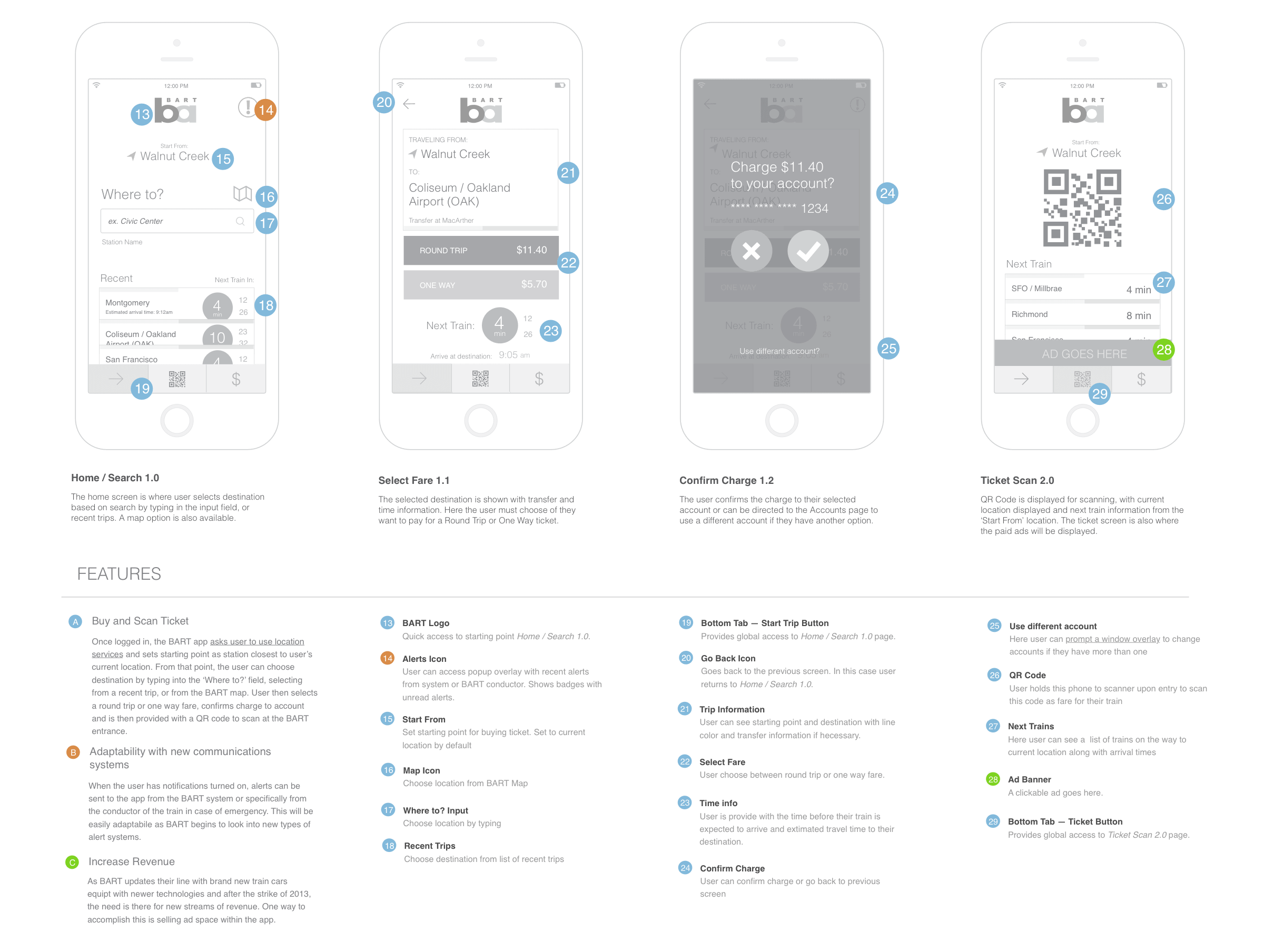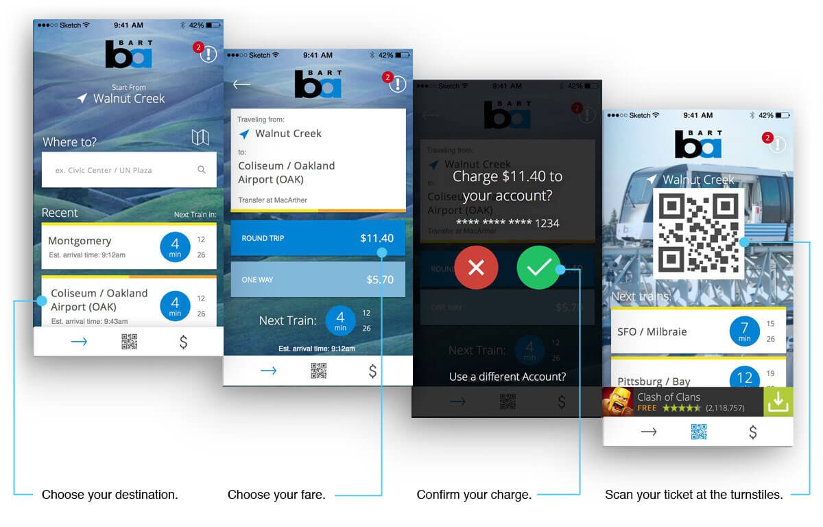 A mobile app that would make using the BART system in the Bay Area a more user-friendly experience. The app would allow users to link a credit or debit card, charge it by the trip, and scan a QR code* at the turnstiles, eliminating the need for a Clipper Card or a ticket from the kiosk.