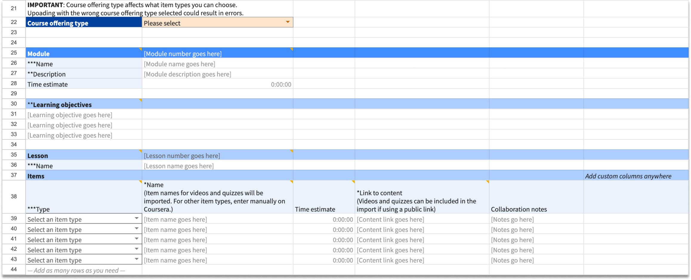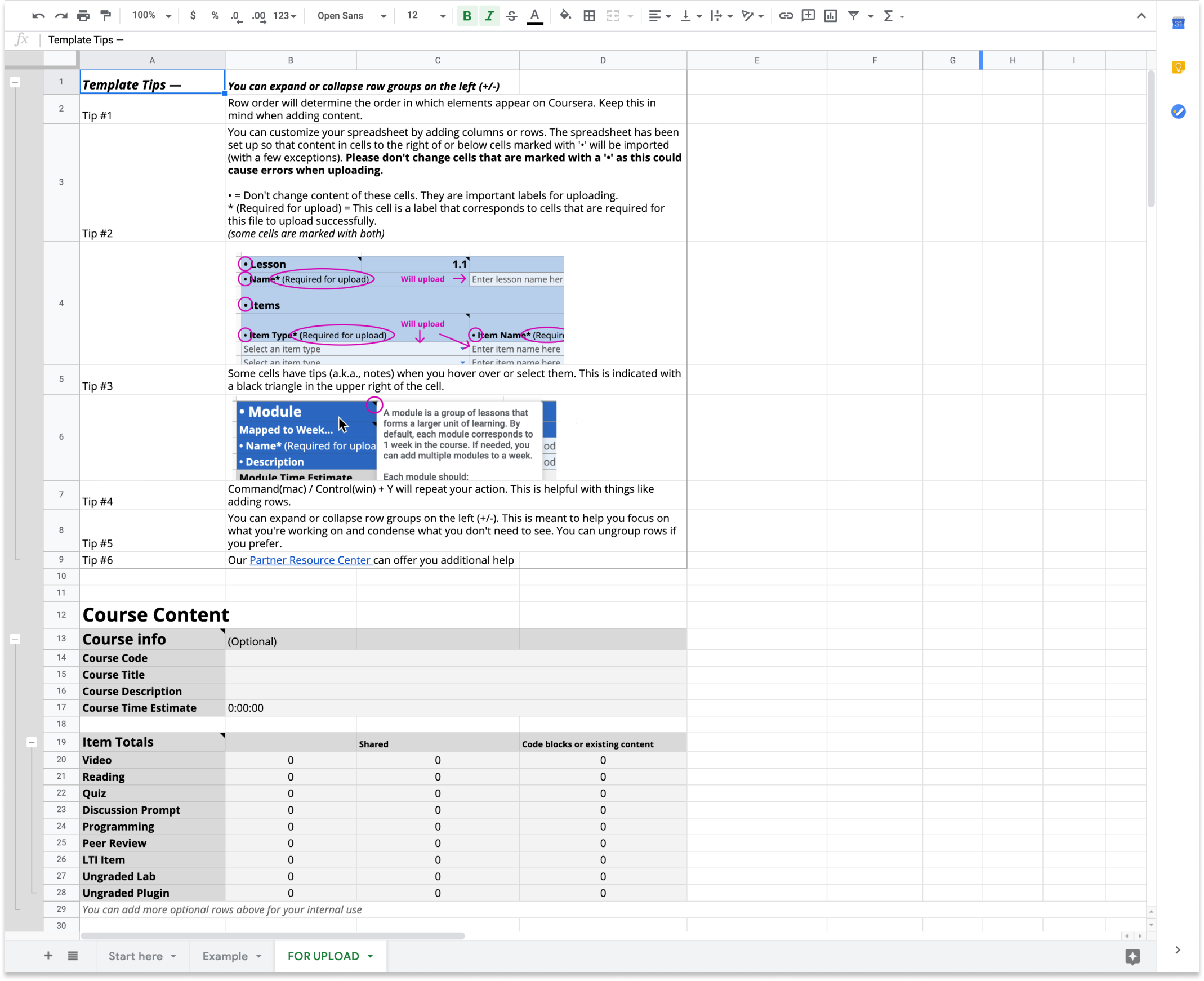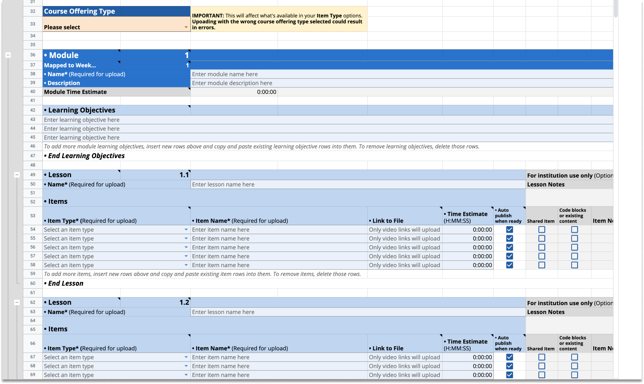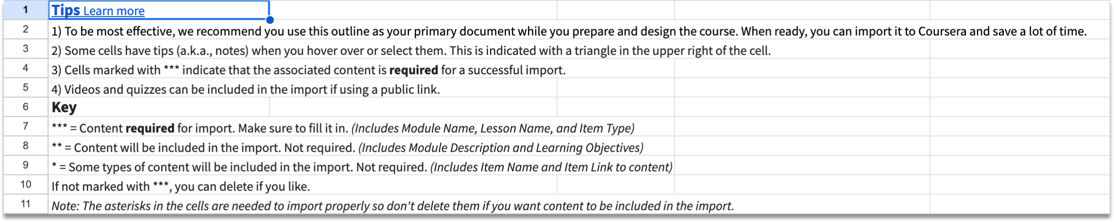A course structure was primarily made up of modules, lessons, and items (videos, readings, or assessments). Some things were required to be filled in for the import to work. There were also things things about how to use the template that I wanted to make sure were noted.