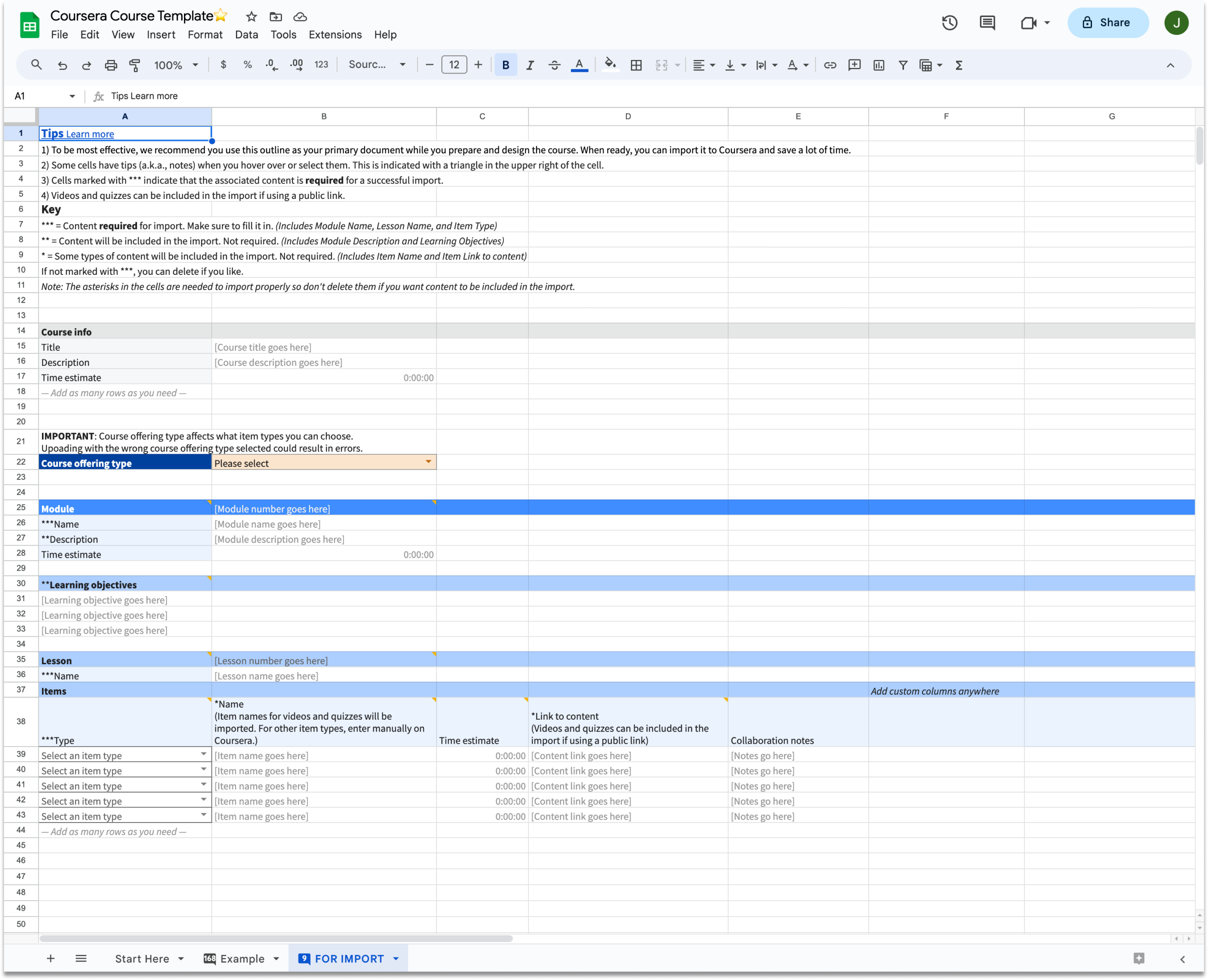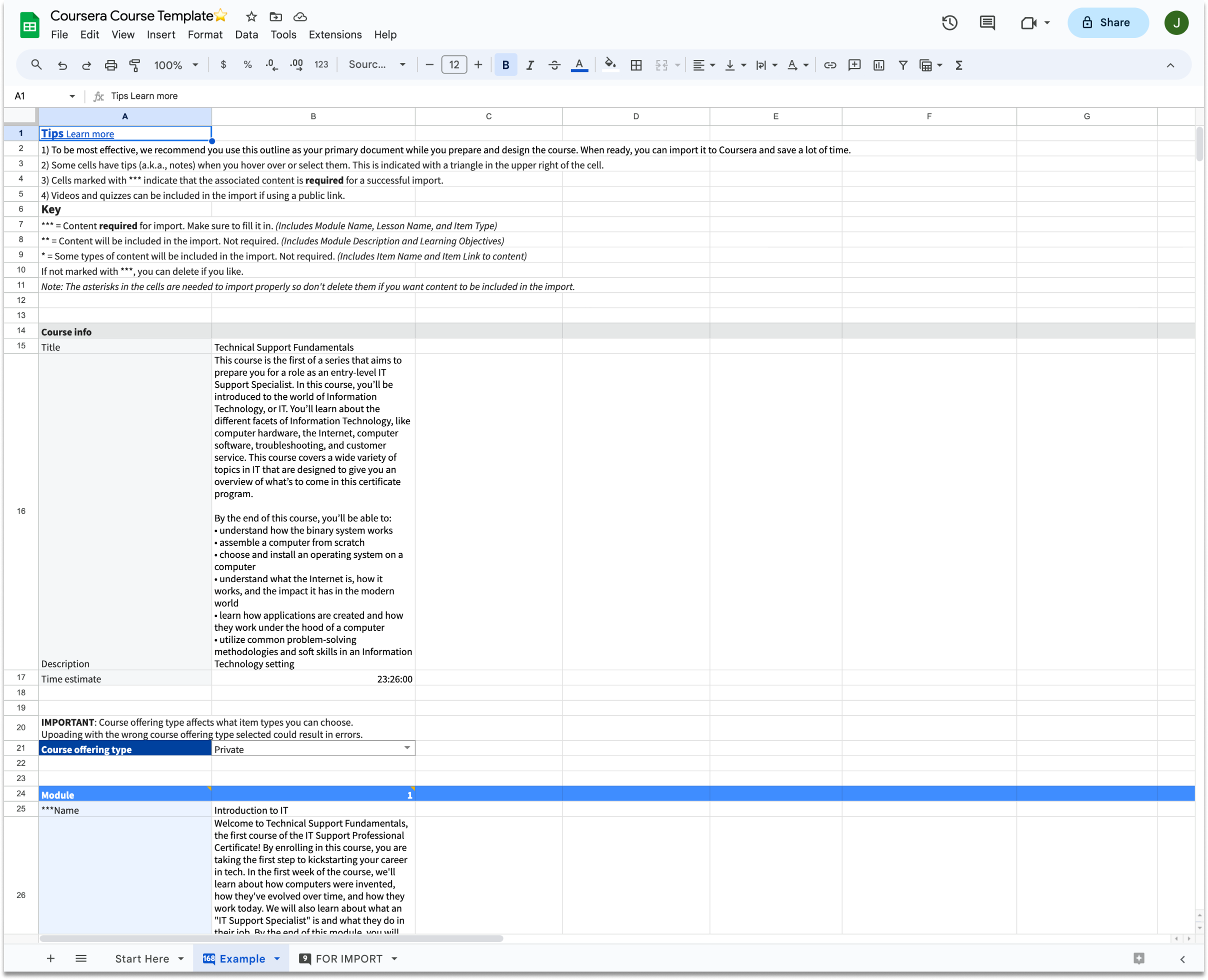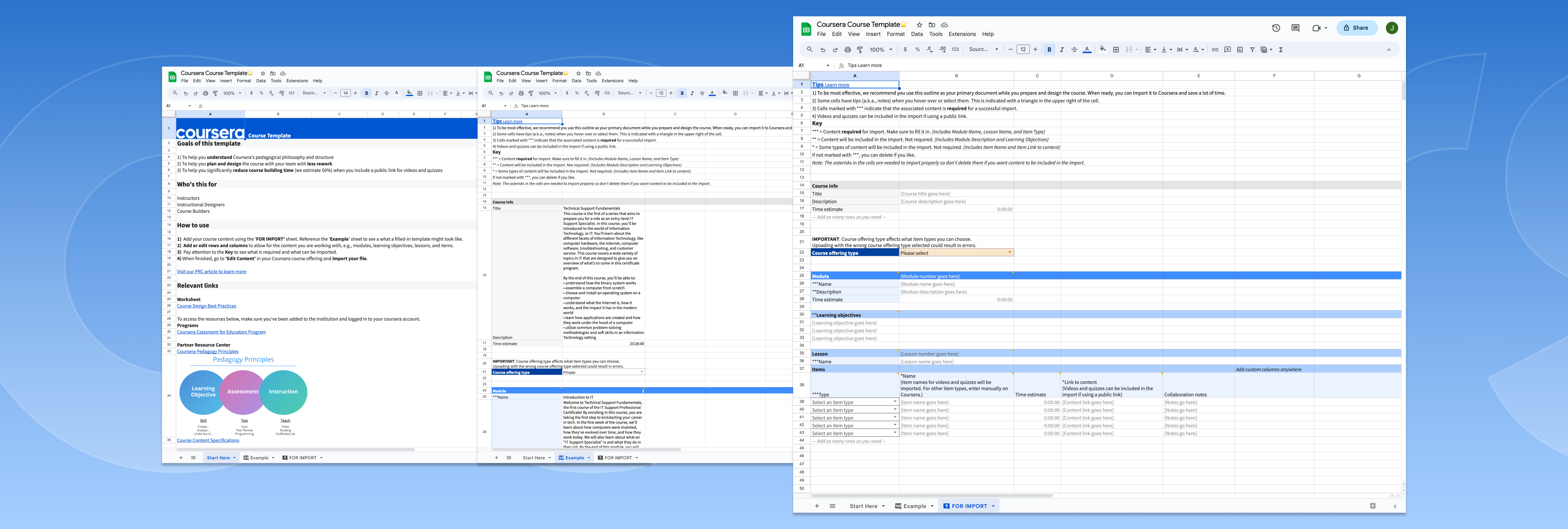 After making the changes and more testing and demonstrations with course authors, we knew we had a viable product. They were much more receptive and willing to try our template on real courses. The final version consisted of three sheets, Start Here, Example, and FOR IMPORT, the actual blueprint and the most important sheet.